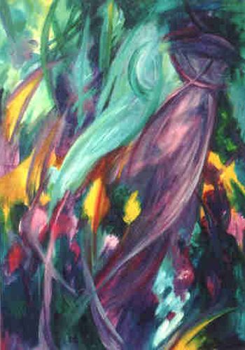 Frühling ... geballte Kraft, die sich in zarter Farbigkeit entlädt. Rosa - hellblau - lindgrün - türkis, wild durcheinander wirbelnd. Chaotische ungeordnete Strukturen einerseits, fest umrissene zwiebelförmige Gestalt andererseits, und leicht flatternd zwischen Form und Ungeformten ein Schmetterling ... Wandlung - Entstehung - Frühling.